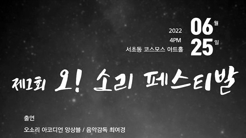 더 보기제1회 오! 소리 페스티벌 2022년 6월 25일 오후 4시 코스모스아트홀주최 주관 : (주)오소리엔터테인먼트 후원 : (주)코스모스악기 (주)지견종합건설, 장미악기, 성남은행로타리클럽 오시는 길 코스모스악기 본사 (예술의전당 앞 위치) 지하 1층 : 코스모스아트...