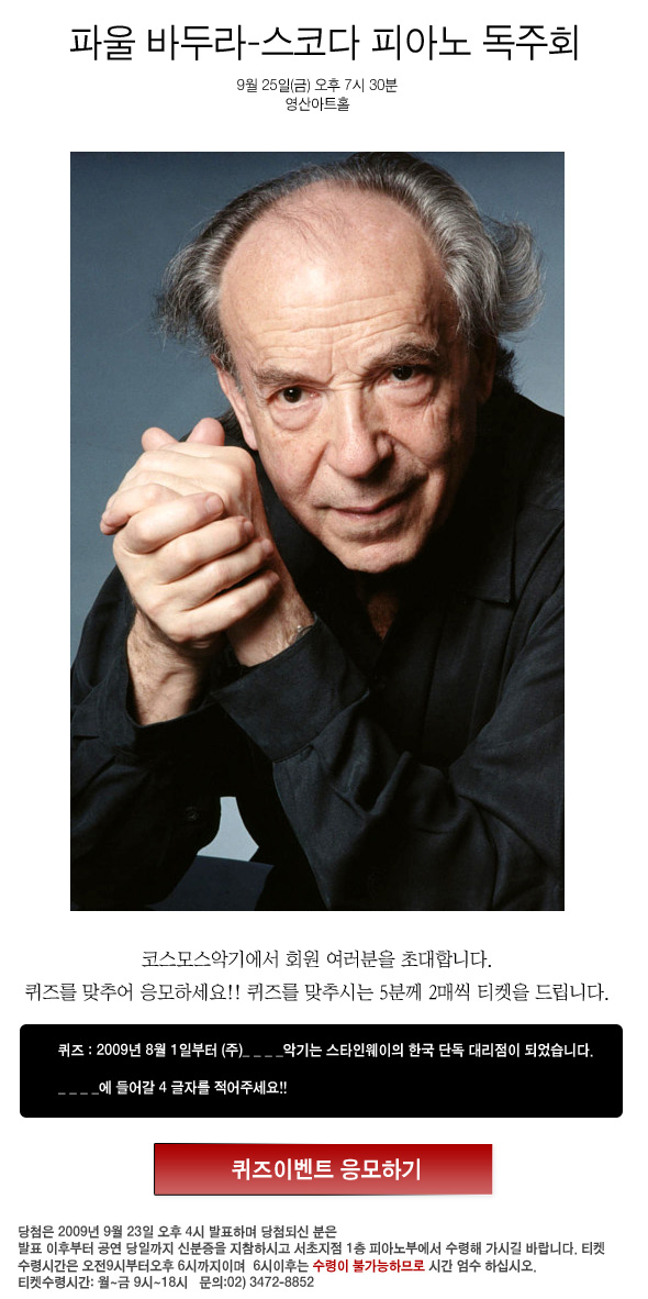 9월 25일(금) 오후 7시 30분 올해로 개관 10주년을 맞이하는 영산아트홀은 문화예술의 불모지였던 여의도에 공원이 조성되던 90년대 후반에 건립되었다. 건립 당시 정치와 금융의 메카로 부각되던 여의도에 문화공간의 설립은 여의도라는 지역적 특수성으로 인한 공연장의 입지조건과 유동인구의 공연장 접근 그리고 관객개발 등 많은 숙제를 가지고 있었으나 10년 동안의 점진적인 인식 전환의 노력으로 대부분 긍정적으로 개선되었다. 또한 2002년 국내 공연장으로는 최초로 파이프오르간이 설치됨으로써 타 공연장과의 변별성을 갖추게 되었고, 교육 세미나와 국제적인 연주자 초청을 통해 내실 있는 공연장으로 그 역할과 중요성을 더욱 공고히 하게 되었다. 개관 10년 주년 동안 영산아트홀은 ‘클래식 전용 공연장’이라는 공연장의 특성에 맞는 중장기 계획을 수립하고 그의 일환으로 전문연주자를 대상으로 하는 ‘신년음악회, 3월에 기획되는 ‘Spring Concert`, 청소년을 대상으로 하는 ‘귀에 익은 클래식’ 등 다양한 정기공연이 기획되고 있으며 초청음악회를 통해 연주자와 관객간의 소통 공간으로서 노력하고 있다. 또한 극장으로서의 사회적 역할을 위해 소외되고 문화적 접근이 어려운 관객에게 극장의 관람 기회를 확대하고 있다. 2009년 올해 영산아트홀에서는 개관 10주년을 맞이하여 10회에 걸쳐 2009 뮤직 페스티벌 시리즈를 기획하여 오르간 페스티벌, 신년음악회, 영아티스트 신인음악회 등 다양한 음악축제를 기획하였다. 그 중 2009년 9월 25일(금)에는 세계적인 피아니스트 바두라 스코다를 초청하여 보다 의미 있는 공연을 선사할 예정이다. 연주자인 바두라 스코다는 데무스, 굴다와 함께 음악계의 빈 삼총사라 불리며 1945년 빈 음악원에 입학, 2년 후 오스트리아 음악 콩쿨 1위 입상, 1948년 벨라 바르토크상 수상, 1949년 롱티보 콩쿨 등에 입상하였으며 빌헬름 푸르트벵글러와 헤르베르트 폰 카라얀이 그의 뛰어난 재능을 일찍이 인정하였고 그와 함께 초청연주를 가졌으며 조지 셀, 칼뵘, 로린 마젤, 주빈 메타, 찰스 메커라스, 게오르그 솔티, 켄트 나가노, 존 엘리어트 가디너와 같은 저명한 지휘자들과도 함께 연주하였다. 또한 그는 음악학자인 부인과 함께 <모차르트 연주법과 해석>을 공저하였으며 모차르트, 베토벤과 슈베르트 피아노 소나타 전곡을 포함한 200여장의 LP와 수십장의 CD 등 수많은 레퍼토리의 작품을 제작 출반하였으며 바릴리 현악 4중주단과의 슈베르트 피아노 5중주 <숭어>, 환상곡 <방랑자>, <악흥(樂興)의 시> 등은 명연주로 손꼽히고 있다. 피아니스트 김성혜는 서울예고, 이화여대 음대 및 동 대학원을 거쳐 맨해튼 음대 석사학위(피아노)를 취득하였으며 동덕여대, 서울시립대, 호서대 예술대 학장을 역임하였다. 그 외에도 베를린 마이스터잘과 동경 국제 포럼, 청주시향ㆍ서울시향 정기연주회, 산타아나 오케스트라와 피아노 협연 등 다양한 연주를 선보였다. 오는 25일(금) 연주회는 바두라 스코다와 김성혜, 두 피아니스트가 함께하는 무대로 모차르트의 4손을 위한 피아노 소나타 라장조 작품번호 381로서 밝고 경쾌하게 시작한다. 두 번째 연주곡부터 바두라 스코다의 독주 무대로서 프랭크 마틴이 바두라 스코다에게 헌정한 작품으로 ‘Fantasy on Flamenco hythms’이며, 다음으로는 베토벤의 후기 피아노 소나타 다장조 작품번호 53번이 연주 될 예정이다. 이날의 대미를 장식하는 작품은 그의 음악적 깊이를 간음할 수 있는 슈베르트의 피아노 소나타 내림 나장조 작품번호 960으로 음악 애호가들의 호기심을 자극하기에 부족함이 없을 것이다. 이번에 개최되는 내한음악회는 1999년 영산아트홀 개관기념 연주를 함께 한 거장 바두라 스코다와의 재회로서 10주년의 의미를 더욱 뜻깊게 하는 음악회이다. 또한 피아니스트 김성혜와의 조화로운 하모니를 통해 영산아트홀이 10년동안의 발자취를 회상하며 초심을 잃지 않고 음악인과 애호가 모두가 함께 진화하는 공간으로 거듭 발전을 기약하는 무대이기도 하다. 10년 동안 화려하지는 않지만 쉬지 않고 움직인 작은 노력들이 앞으로 10년 동안 계속 지속될 것이며 그것이 영산아트홀의 밑거름이 될 것이라 확신한다. 이번 개관 음악회에 참석하신 많은 분들의 가슴속에 영산아트홀의 진정성이 음악에 녹아 오랜 동안 기억에 남길 바란다. PROGRAM Frank Martin Fantasy on Flamenco Rhythms(1973) L. v. Beethoven Sonata C Major Op. 53(Waldstein)